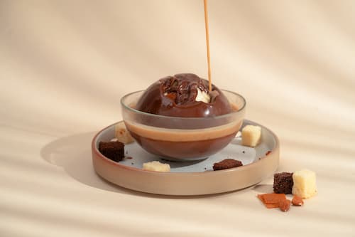 قطعة من السعادة الداكنة بداخل قبة الشوكلاته مع حشوة الكيندر ورقائق الدانيتيل المقرمش يقدم مع آيسكريم الفانيلا وصوص الكراميل الساخن.